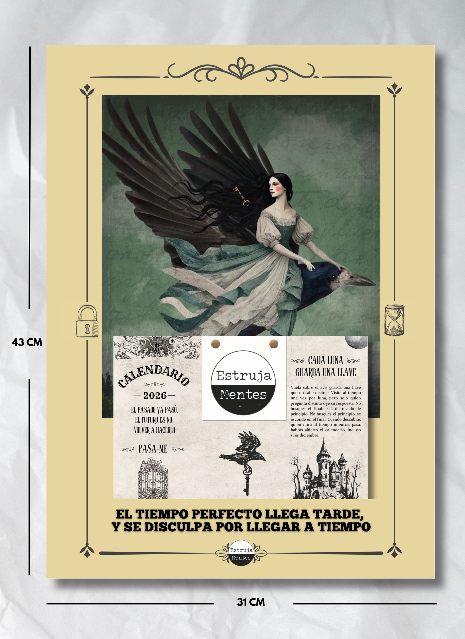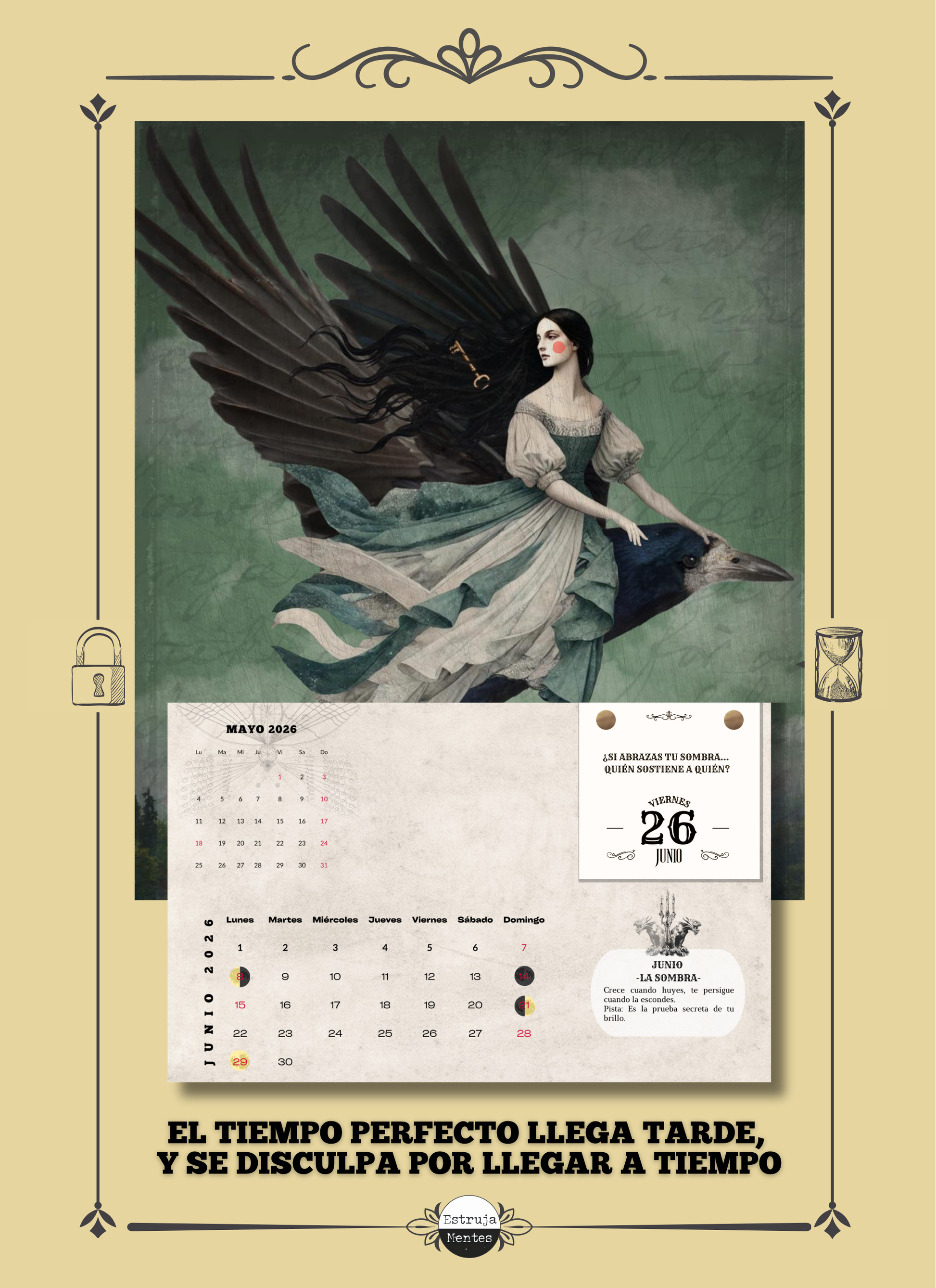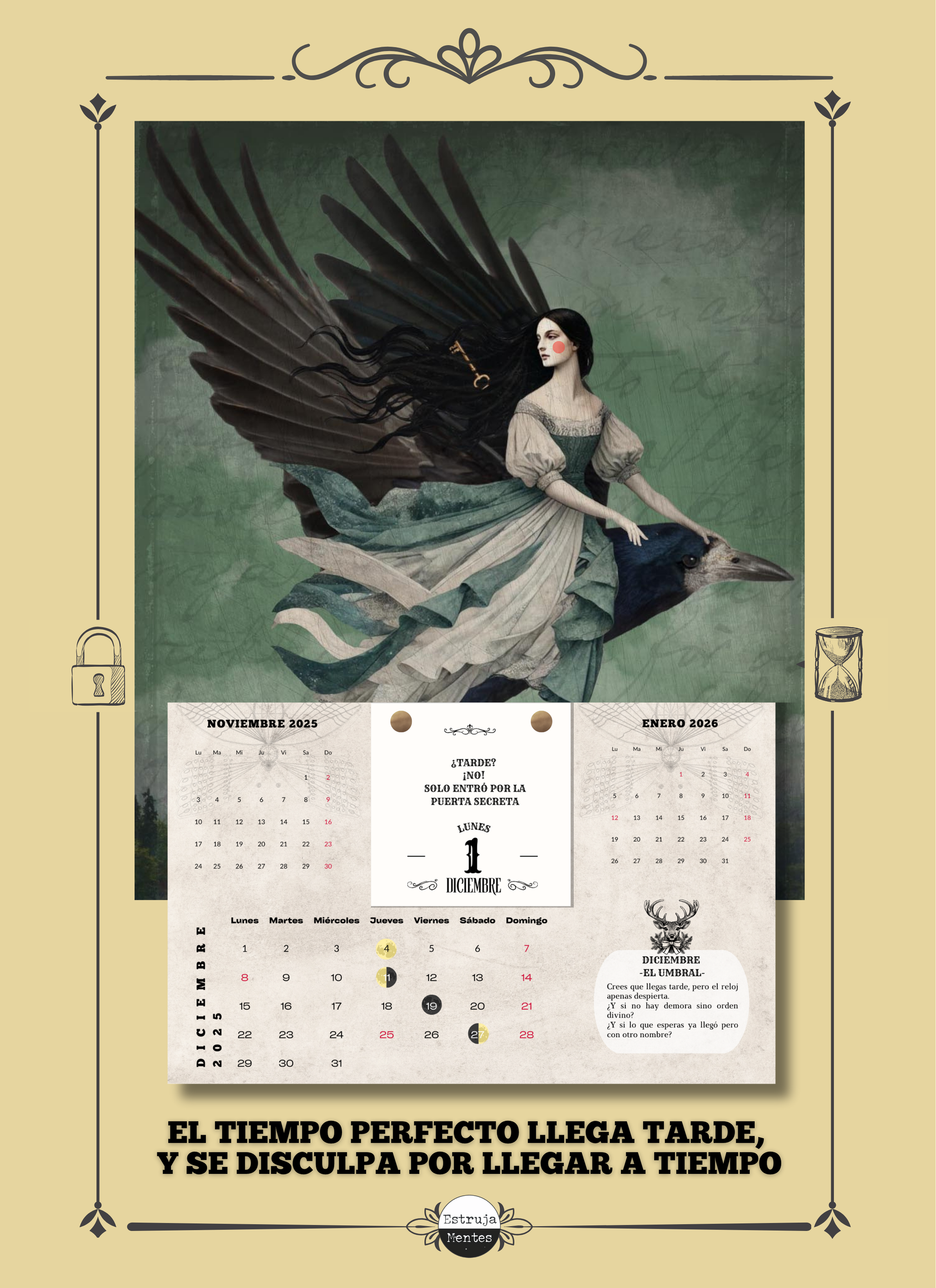 12 meses temáticos (llave, espejo, reloj roto, puerta sin cerradura, ave, sombra, laberinto, llama, hilo, disfraz, guardián, llegada).