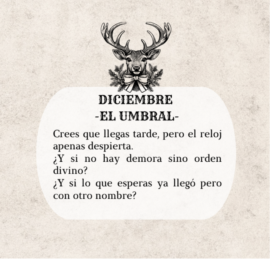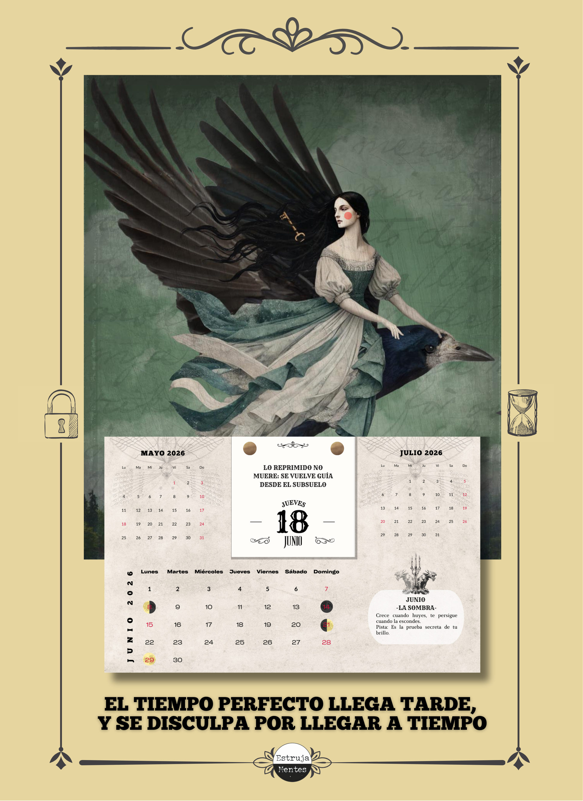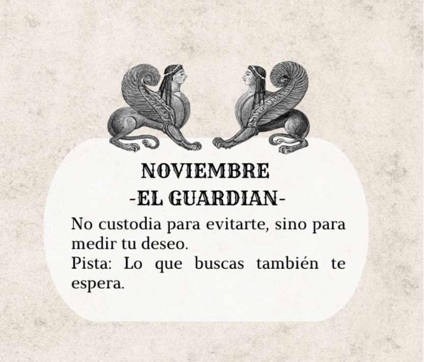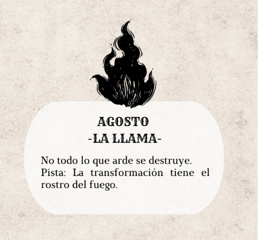 12 meses temáticos (llave, espejo, reloj roto, puerta sin cerradura, ave, sombra, laberinto, llama, hilo, disfraz, guardián, llegada).